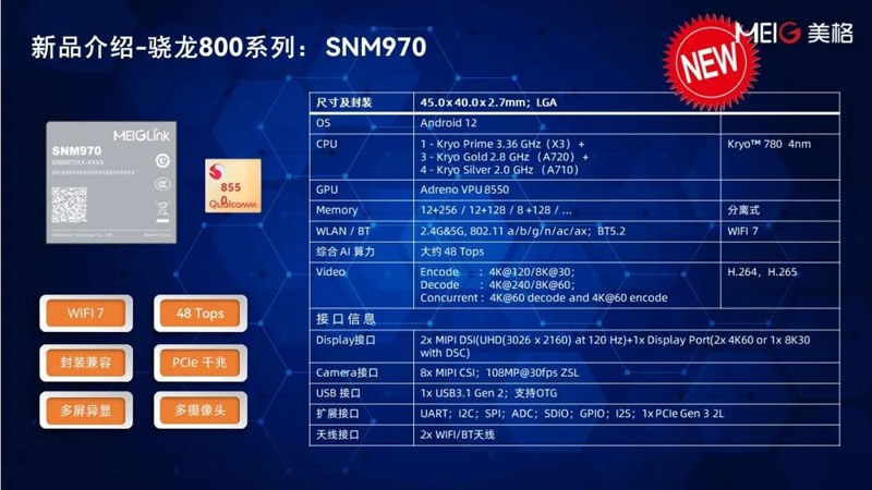 美格智能AI算力智能模組矩陣,產(chǎn)品對應(yīng)算力涵蓋0.2Tops~48Tops。最新發(fā)布的高算力AI智能模組SNM970搭載高通QCS8550處理器,集成8核高通Kryo CPU,支持Wi-Fi 7和藍(lán)牙5.3,創(chuàng)造更加穩(wěn)定、暢快的網(wǎng)絡(luò)體驗(yàn)。集成高通神經(jīng)網(wǎng)絡(luò)處理單元高通Hexagon? 處理器,為整個系統(tǒng)提供開創(chuàng)性的AI性能,在高達(dá)48Tops AI算力的加持下,能夠?qū)A繑?shù)據(jù)進(jìn)行高速、高質(zhì)的計(jì)算和處理,為行業(yè)應(yīng)用和場景創(chuàng)造更大想象空間。