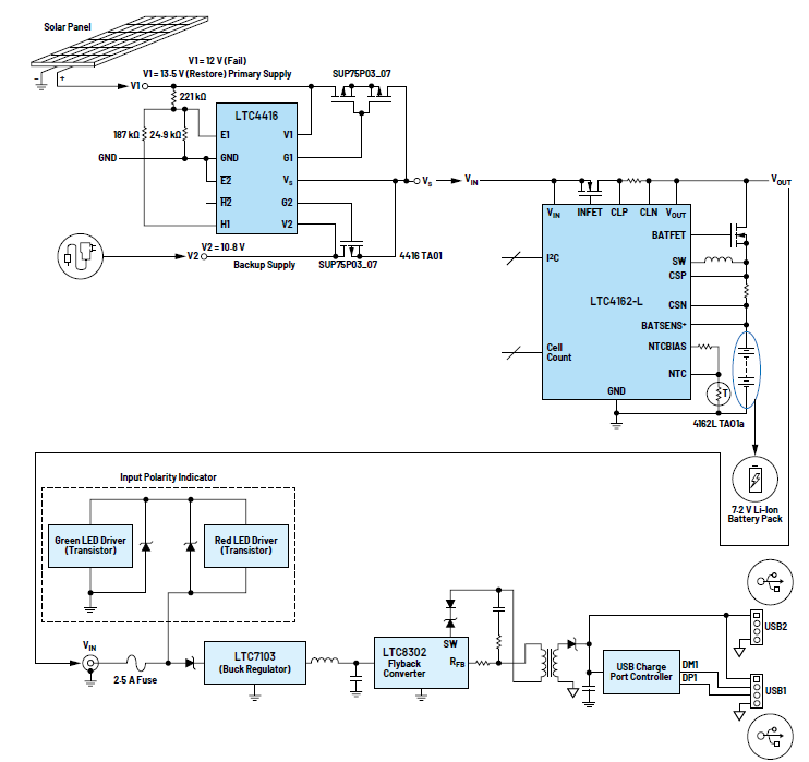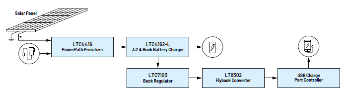 此應(yīng)用包括的選項(xiàng)有通過太陽能給電池充電,或通過標(biāo)準(zhǔn)12 V AC-DC壁式電源適配器的直流輸入進(jìn)行充電。輸出包括一些基本USB-A充電端口(總共兩個),其產(chǎn)生5 V電壓,用于移動電話和一系列USB供電的電子設(shè)備。