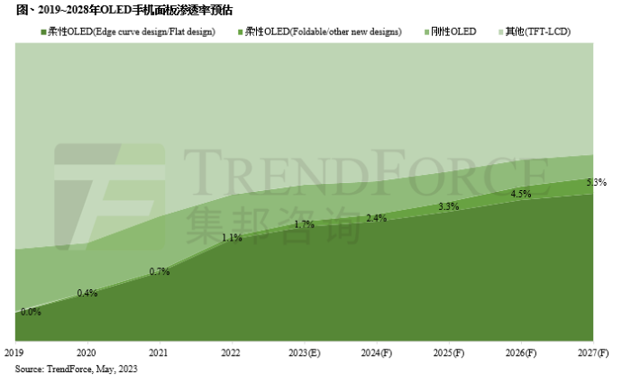 目前市場聚焦剛推出的Google Pixel Fold,搭配7.6吋2208x1840 分辨率的OLED面板,外屏幕為5.8吋 2092x1080分辨率OLED面板,而長期耕耘非洲市場的傳音也在今年初發(fā)表第一只折疊手機Phantom V Fold。在有更多品牌加入生產(chǎn)折疊手機的預(yù)期下,TrendForce集邦咨詢預(yù)估2023年折疊手機市場滲透率約為1.7%,成本與外型將逐年優(yōu)化,2027年有機會逾5%。