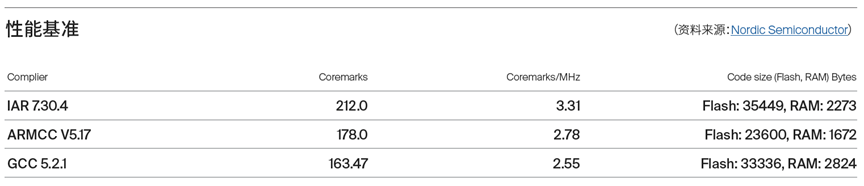 同樣,我們通過CoreMark基準(zhǔn)對市面上流行的MCU編譯器輸出的代碼性能進(jìn)行分析。這里我們舉例來自Nordic Semiconductor芯片的CoreMark基準(zhǔn)測試數(shù)據(jù)。選用“極致性能”編譯優(yōu)化選項參數(shù)進(jìn)行編譯時,IAR Embedded Workbench for Arm確實遠(yuǎn)超其他工具。如下表所示,從這些基準(zhǔn)測試中,可以看到IAR Embedded Workbench比Keil工具鏈高出19.1%,比GCC工具鏈高出驚人的29.8%。建議在CoreMark網(wǎng)頁上查看當(dāng)前最新的分?jǐn)?shù)。也可以自己運(yùn)行基準(zhǔn)測試以獲得精確的數(shù)字。