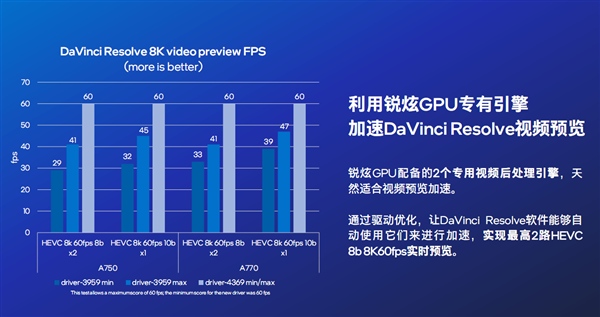 此外,DaVinci Resolve還能夠充分利用Intel Arc銳炫顯卡的視頻后處理器引擎,從而帶來近2倍的性能提升,還實現(xiàn)了雙路8K60FPS視頻素材的實時預(yù)覽。