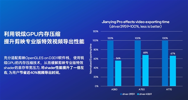 此外,Intel Arc銳炫顯卡充分適配了剪映的OpenGL ES on D3D11軟件棧,結(jié)合內(nèi)存壓縮技術(shù),可環(huán)節(jié)剪映特效著色器(Shader)的顯存帶寬壓力,性能提升了一倍左右,視頻導(dǎo)出時間節(jié)省接近40%。