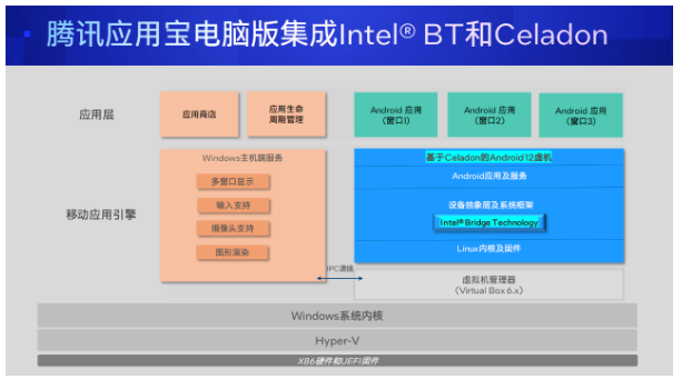 一是底層的Intel Bridge技術(shù),一種運(yùn)行時(shí)后期編譯器(runtime post-compiler),運(yùn)行在設(shè)備抽象層和系統(tǒng)框架之上,可將非x86指令直接編譯成x86指令,且無(wú)需任何進(jìn)一步修改,就能讓未經(jīng)編譯適配的Android應(yīng)用運(yùn)行在基于x86處理器、Windows系統(tǒng)的設(shè)備上。