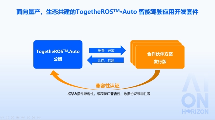 此外,TogetheROS.Auto智能駕駛開發(fā)套件還采用了類似Linux社區(qū)運作模式。地平線將持續(xù)打造更好的TogetheROS.Auto公版方案,并面向行業(yè)合作伙伴開放賦能。所有的合作伙伴均可以基于公版源碼衍生出私有發(fā)行版,而地平線會對公版和發(fā)行版提供兼容性認(rèn)證服務(wù),讓各合作伙伴間的組件充分兼容。
