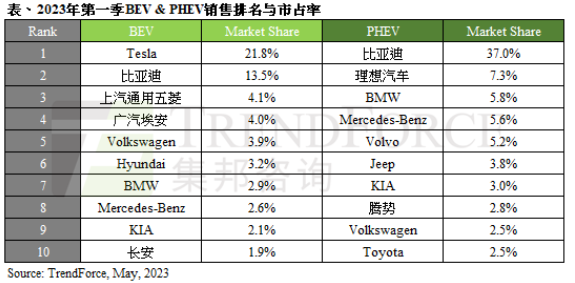 插電混合式電動(dòng)車(chē)方面,比亞迪以市占率37%持續(xù)穩(wěn)居第一,比亞迪與戴姆勒集團(tuán)合資的電動(dòng)車(chē)品牌騰勢(shì)(Denza)也在第一季躍上第八名。比亞迪的多品牌策略已成形,除了騰勢(shì)外還有定位在豪華高端的「仰望」品牌將加入戰(zhàn)局。理想汽車(chē)第一季竄升至第二名,多車(chē)款為其帶來(lái)單季銷(xiāo)售5.2萬(wàn)輛的成績(jī),市占率提高至7.3%。三大歐系豪華車(chē)品牌BMW、Mercedes-Benz、Volvo在PHEV銷(xiāo)售排名仍位居前段,但銷(xiāo)量相較去年同期有所下滑。