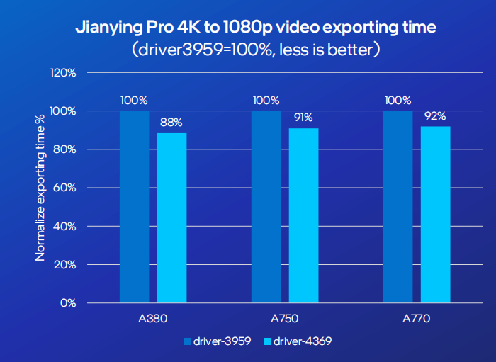 同時(shí),通過驅(qū)動(dòng)優(yōu)化,還實(shí)現(xiàn)了剪映特效著色器(Shader)性能近一倍的提升,滿足了剪映OpenGL?ES?on?D3D11軟件棧與英特爾銳炫顯卡的充分適配,使用銳炫GPU的內(nèi)存壓縮技術(shù),從而緩解剪映專業(yè)版特效?shader的顯存帶寬壓力,將shader性能提升了一倍左右,幫助用戶節(jié)省約40%的導(dǎo)出時(shí)間(4369版對(duì)比3959版)。
