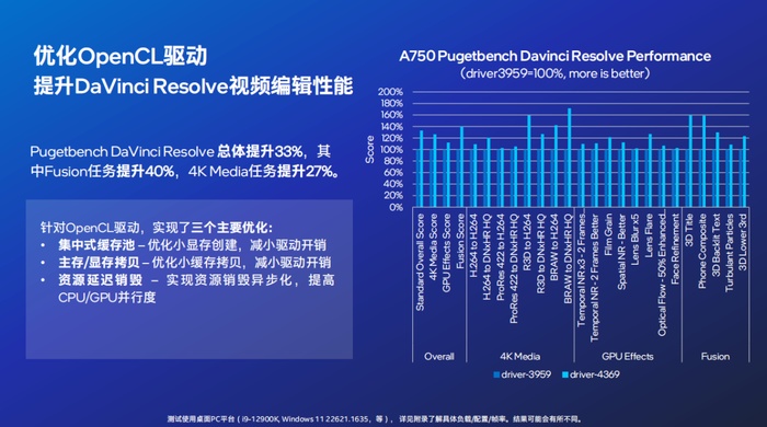 英特爾驅(qū)動(dòng)針對(duì)內(nèi)容創(chuàng)作進(jìn)行了持續(xù)的優(yōu)化,通過減少額外消耗,充分釋放出銳炫硬件性能。針對(duì)OpenCL驅(qū)動(dòng)實(shí)現(xiàn)了三個(gè)主要優(yōu)化,提升了DaVinci?Resolve視頻編輯性能。全新的4369版驅(qū)動(dòng)相比于3959版驅(qū)動(dòng),Pugetbench?DaVinci?Resolve總體提升33%,其中Fusion任務(wù)提升40%,4K?Media任務(wù)提升27%。
