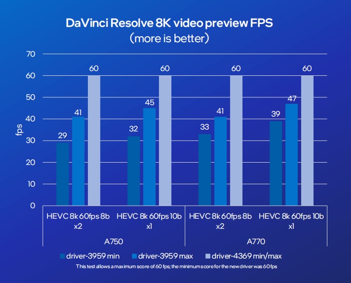 銳炫GPU配備了2個(gè)專用視頻后處理引擎,通過驅(qū)動(dòng)的優(yōu)化,DaVinci能夠充分利用英特爾銳炫顯卡的視頻后處理器引擎,從而帶來近2倍性能提升,這實(shí)現(xiàn)了雙路8K60FPS視頻素材的實(shí)時(shí)預(yù)覽。