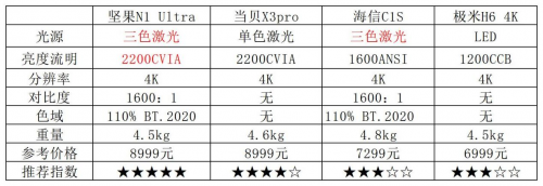 具體來看,堅果N1 Ultra和海信C1S同屬于三色激光陣營,前者去年底發(fā)布,海信這款今年發(fā)布,但后來者并未居上,兩款產(chǎn)品色域、對比度、和分辨率上都一致,但是在亮度上,堅果N1 Ultra高達2200 CVIA,比海信C1S高出一大截,白天拉開窗戶,光線明亮的環(huán)境下效果也很好,在光線較暗時效果更佳。而海信C1S同為三色激光,亮度上誠意顯得不足,當然價格也做出了讓步。