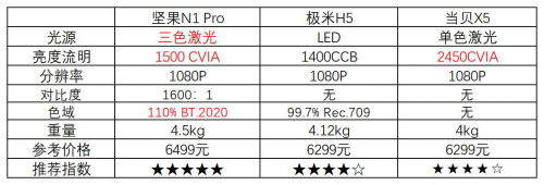 5000-6000價位屬于中高端投影級別,挑選出最具代表的三款投影:堅果N1 Pro、極米H5、當貝X5,200元的價格差,相同的基礎參數(shù),如分辨率為1080P,芯片MT-9669,顯示芯片0.47''DMD,內(nèi)存4GB+64GB等。