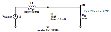如果轉(zhuǎn)換器的輸入功率為30 W,則當(dāng)電壓為12 V時(shí),可通過(guò)計(jì)算得到電阻為–122/30 Ω = –4.8 Ω。輸入濾波器由LC濾波器組成。假設(shè)輸入由低電阻電源饋入,則可以簡(jiǎn)化等效電路,并將其歸結(jié)為圖4所示的示例原理圖,其中理想情況下電源為0 Ω。