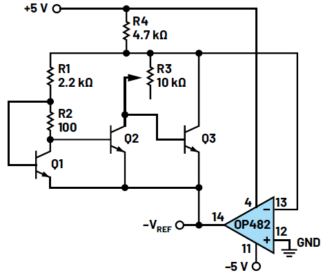 打開正負(fù)電源。觀察-VREF處(運算放大器的引腳14)的電壓和帶隙并聯(lián)穩(wěn)壓器(Q3的集電極和發(fā)射極)上的電壓??梢哉{(diào)整電位計R3以產(chǎn)生-1.25 V基準(zhǔn)電壓。