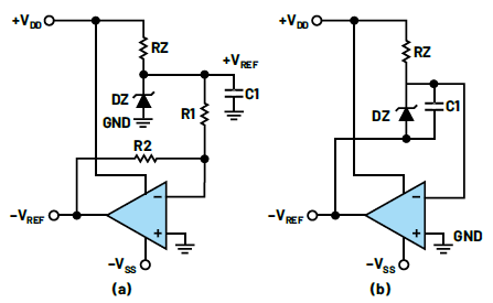 考察圖1a可以發(fā)現(xiàn),由于反相運算放大器配置的虛地特性,齊納電壓+VREF作用于電阻R1上。如果R2正好等于R1,則同一電壓VREF也會出現(xiàn)在R2上,但相對于地的符號相反。R2兩端的電壓與齊納二極管兩端的電壓相同,因此我們實際上可以用反饋環(huán)路中的二極管代替R2,如圖1b所示,并且仍然在-VREF處產(chǎn)生相同的電壓。RZ只是設(shè)置齊納二極管中的偏置電流水平,與圖1a中的RZ非常相似。在圖1b中,IZ等于VDD/RZ,而在圖1a中,IZ等于(VDD – +VREF)/RZ。為使兩種情況下的設(shè)計具有相同的IZ,我們只需更改RZ的值。電容C1解耦接地端和輸出端之間的基準(zhǔn)二極管。此外,具有低電感的0.1μF電源解耦電容(圖1中未顯示)通常連接到+VDD和-VSS,非??拷\算放大器。