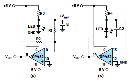 圖2.生成-VREF的兩種可能方法:(a)使用兩個匹配電阻(R1和R2)的標(biāo)準(zhǔn)方法,以及(b)不使用電阻的更高精度方法——使用LED代替圖1a和1b中的齊納二極管