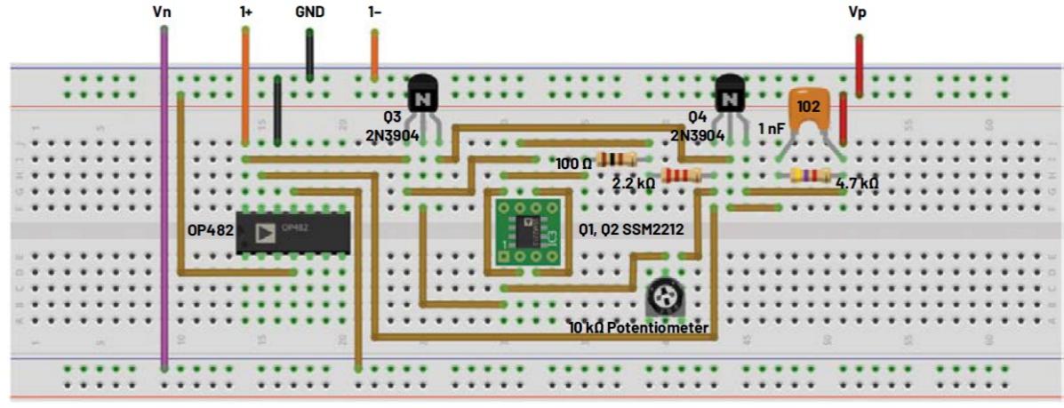 修改第1步中的試驗板設(shè)置,如圖5所示。對試驗板進(jìn)行任何修改之前,確保關(guān)閉電源。用并聯(lián)穩(wěn)壓器替換LED。電阻R1和R2以及晶體管Q1連接為零增益放大器。如同在穩(wěn)定電流源中一樣添加電阻R3和晶體管Q2。如果使用SSM2212匹配的NPN對,應(yīng)將其用于器件Q1和Q2。添加Q3作為共發(fā)射極,其基極連接到Q2的集電極,集電極連接到R1、R3和R4的組合節(jié)點。