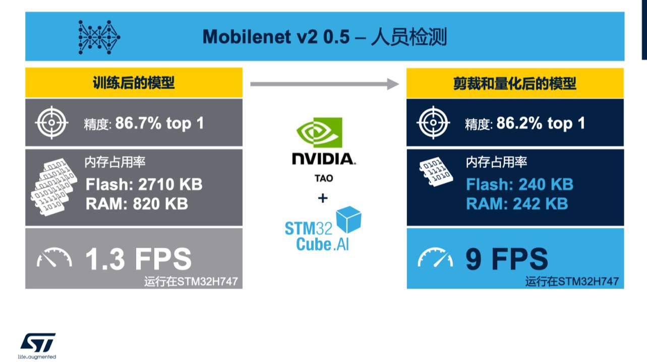 經(jīng)過(guò)優(yōu)化后的算法部署在端側(cè),精度方面是否會(huì)大打折扣?這應(yīng)該是開發(fā)者們非常關(guān)注的一點(diǎn)。而在峰會(huì)現(xiàn)場(chǎng)英偉達(dá)的演示來(lái)看,在足夠好的優(yōu)化之后,這并不會(huì)成為一個(gè)問(wèn)題。通過(guò)英偉達(dá)深度學(xué)習(xí)技術(shù)經(jīng)理吳永亮 Luis WU在峰會(huì)現(xiàn)場(chǎng)分享的案例來(lái)看,通過(guò)NVDIA TAO 5.0訓(xùn)練后的人員檢測(cè)模型,可以直接部署在STM32H747上,但內(nèi)存占用和更新率較低。而進(jìn)一步經(jīng)過(guò)STM32 Cube.AI對(duì)于模型的剪裁和量化后,精度僅降低了0.5%,但內(nèi)存占用率獲得了數(shù)倍降低,而更新率則直接從1.3FPS提高到了9FPS,優(yōu)化效果非常明顯。