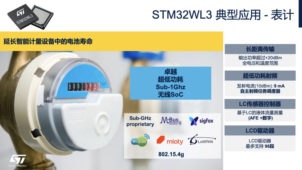 不難看出,STM32WL3其實(shí)非常適合智能表計(jì)的應(yīng)用,傳感器外設(shè)可以連接水、電、氣、熱等傳感器信號(hào),LCD用于顯示數(shù)據(jù),射頻單元用于傳輸表計(jì)數(shù)據(jù)。STM32WL3的多調(diào)制射頻單元可以支持Sigfox、W-BUS、Mioty和Wi-Sun等多種協(xié)議;專用的喚醒射頻單元在接收模式下僅消耗4.2μA,可以保證MCU核更多時(shí)間處在低功耗狀態(tài),僅在接收到數(shù)據(jù)包時(shí)候才喚醒。