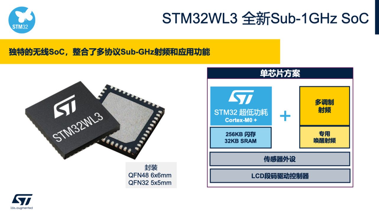 在LPWAN方面,ST帶來(lái)了更新的產(chǎn)品型號(hào)STM32WL3。該產(chǎn)品采用單芯片方案,一個(gè)芯片上集成了兩個(gè)射頻單元和一個(gè)Cortex-M0+內(nèi)核;同時(shí)還具有LCD控制器、傳感器等豐富外設(shè)。