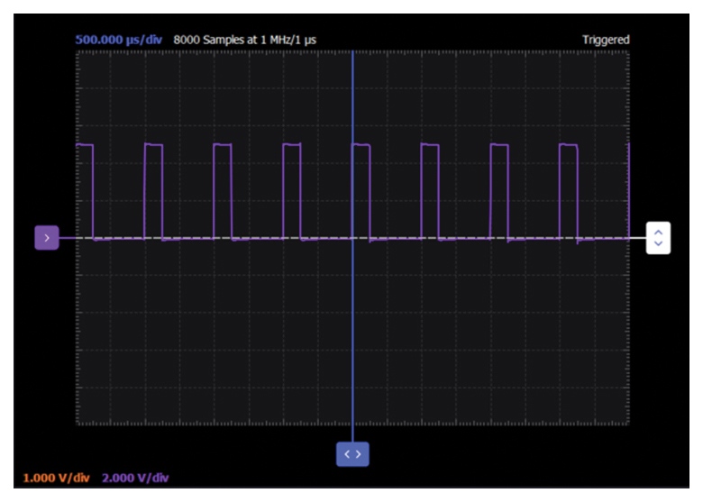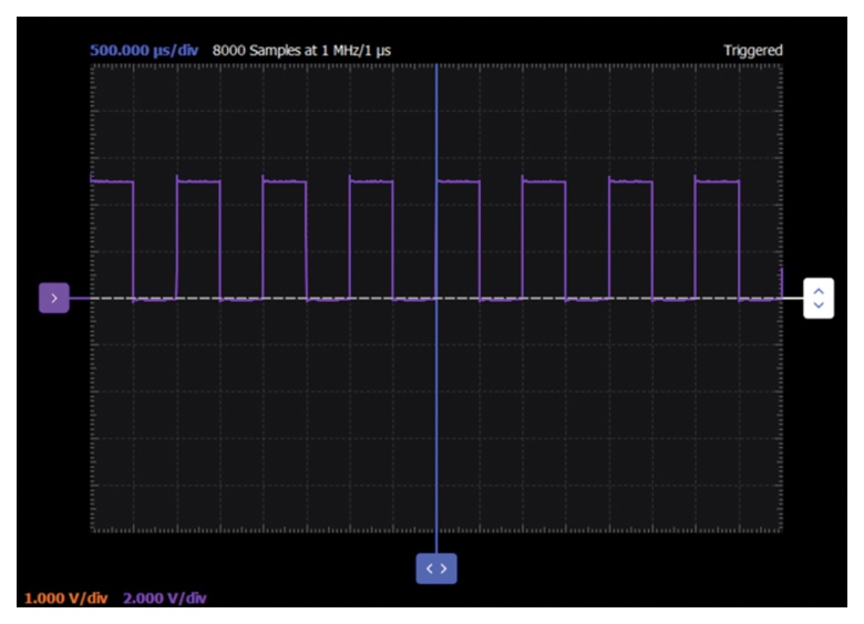 現(xiàn)在將兩個AWG通道均配置為峰峰值為5V的方波。將AWG1設(shè)置為1 kHz頻率,將AWG2設(shè)置為2 kHz頻率或AWG1頻率的兩倍。將AWG2的相位設(shè)置為0度。確保將AWG設(shè)置為同步運行。