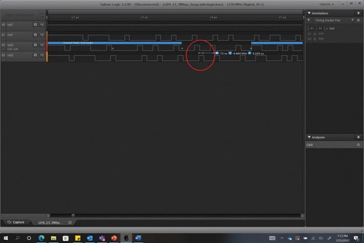 以CAN收發(fā)器MAX33012E為例,該收發(fā)器已經(jīng)過(guò)20米線纜測(cè)試,速率最高可達(dá)13.3 Mbps??梢钥吹?,在圖5中,TXD2位寬為75 ns(對(duì)應(yīng)于13.3 Mbps),RXD2位寬為72 ns。當(dāng)控制器以80%的TXD位寬進(jìn)行采樣時(shí),包括所需RXD的上升時(shí)間/下降時(shí)間和環(huán)路延遲在內(nèi)的最小RXD位寬為60 ns。在圖5中,可以看到接收到的位寬為72 ns。因此,MAX33012E滿足條件,并且足夠穩(wěn)健,能夠在更高的位速率下工作。在這種情況下,CAN控制器不會(huì)檢測(cè)到任何錯(cuò)誤,并且會(huì)繼續(xù)執(zhí)行數(shù)據(jù)通信。