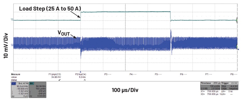 圖6.在28 A/μs擺率下,22 A至50 A負(fù)載階躍的瞬態(tài)波形。
