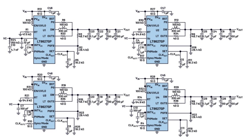 LT8627SP作為峰值電流模式控制IC,可輕松配置為多相操作。有幾項(xiàng)設(shè)計(jì)考慮因素需特別注意,分別是: