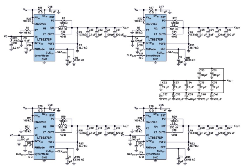 圖1.為1.8 VOUT、50 A RF數(shù)字負(fù)載供電的四相交錯(cuò)LT8627SP解決方案。