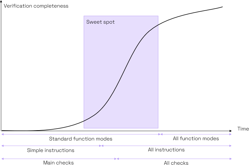 應用這種方法可以提高驗證團隊的工作效率。在項目的關鍵階段提高效率。雖然在開始時構建正確的設置需要付出努力,但隨著我們添加新的指令類別和新的檢查器,進度就會加快。這個“最佳點”是我們發(fā)現(xiàn)大多數(shù)問題的地方,隨著放寬約束以允許該工具探索更深奧的操作模式,速度就開始放緩。