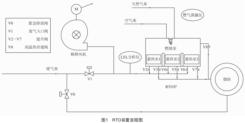 RTO爐主要用來處理濃度2~8g/m3的有機(jī)廢氣[1]。三室RTO爐主要是由一個(gè)燃燒室、三個(gè)蓄熱室與提升閥等組成。圖1為RTO裝置流程圖,首先采用燃燒器將RTO爐預(yù)熱到指定溫度,然后混合廢氣通過RTO爐氧化燃燒后獲得Co2和H2o,達(dá)到達(dá)標(biāo)排放的目的。RTO爐內(nèi)部的廢氣處理流程為:廢氣進(jìn)入RTO爐1#蓄熱室進(jìn)行預(yù)熱,再進(jìn)入燃燒室進(jìn)行有機(jī)物的氧化反應(yīng),最后通過2#蓄熱室離開RTO爐排出凈煙氣:廢氣從2#蓄熱室進(jìn)入燃燒室,通過3#蓄熱室排出凈煙氣:廢氣從3#蓄熱室進(jìn)入燃燒室,通過1#蓄熱室排出凈煙氣。通過三輪處理過程不停地循環(huán)往復(fù),保持RTO爐的熱量恒定,同時(shí)保障RTO爐的廢氣凈化效果。燃燒室內(nèi)部隨著有機(jī)物氧化反應(yīng)的放熱,溫度逐漸升高,當(dāng)溫度達(dá)到高設(shè)置值時(shí),必須打開高溫?zé)崤酝ㄩy門,以降低燃燒室的溫度。為保證RTO爐正常運(yùn)行,需要監(jiān)控RTO爐的溫度、壓力以及進(jìn)入RTO爐前的混合廢氣的爆炸下限。