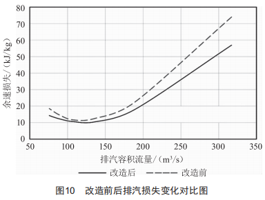 低壓末級(jí)通流面積大、葉片高,葉片通流部分根部和頂部的流動(dòng)差異非常大,因此末級(jí)動(dòng)、靜葉片的型線以及彎扭規(guī)律的優(yōu)劣相對(duì)于壓力級(jí)顯得更為重要。氣動(dòng)設(shè)計(jì)上,需要保證額定工況和變工況整個(gè)運(yùn)行范圍內(nèi)都具有較高的氣動(dòng)性能。在進(jìn)行末級(jí)葉片設(shè)計(jì)開發(fā)時(shí),對(duì)其變工況性能給予了特別關(guān)注。如圖10所示,選用的末級(jí)葉片余速損失在所有工況均優(yōu)于改造前。