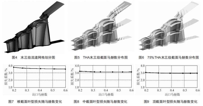 馬赫數(shù)適應(yīng)性主要由葉片喉部之后的型線決定,本文計(jì)算了小汽輪機(jī)100%THA及常用工況75%THA下整個(gè)流場(chǎng)情況,以末三級(jí)葉片根、中、頂三個(gè)截面的馬赫數(shù)為例,計(jì)算結(jié)果如圖4~圖6所示。