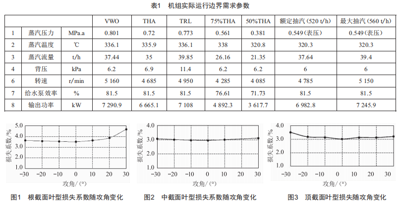 小汽輪機(jī)在變負(fù)荷運(yùn)行時(shí),因流量、轉(zhuǎn)速發(fā)生變化,各級(jí)速度三角形會(huì)偏離設(shè)計(jì)值,導(dǎo)致變負(fù)荷性能下降。為解決高效寬負(fù)荷運(yùn)行問題,本次改造主要從兩方面入手:其一,全面分析小汽輪機(jī)所有運(yùn)行工況,評(píng)估各個(gè)工況的運(yùn)行時(shí)長(zhǎng)及其對(duì)電廠整個(gè)機(jī)組的經(jīng)濟(jì)性影響權(quán)重,最終合理選擇一個(gè)最優(yōu)工況點(diǎn)作為設(shè)計(jì)工況,使變工況對(duì)性能的影響降到最小。其二,優(yōu)化小汽輪機(jī)葉片設(shè)計(jì),精心設(shè)計(jì)進(jìn)汽攻角、反動(dòng)度,使葉片自身的變工況性能較原設(shè)計(jì)得到大幅提升。