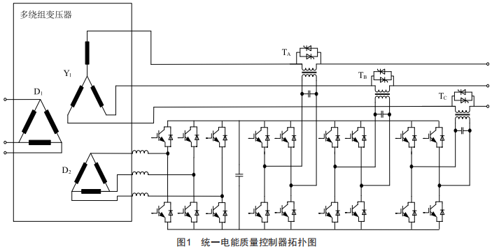 UPOC系統(tǒng)由多繞組變壓器、補(bǔ)償單元、整流單元以及靜態(tài)開關(guān)四部分組成。除去整流單元,補(bǔ)償部分可以等效為圖1所示的拓?fù)浣Y(jié)構(gòu)。等效圖中的多繞組變壓器,原邊采用三角形繞組D1,一組副邊使用星形繞組Y1,另一組副邊采用三角形繞組D2,D2連接于并聯(lián)變流器的交流側(cè),Y1中的各相通過串聯(lián)變流器各橋臂串聯(lián)輸出后連接于負(fù)載。串聯(lián)部分由串聯(lián)變壓器和反并聯(lián)晶閘管構(gòu)成,其中反并聯(lián)晶閘管用于變流器故障情況下輸出回路切換。并聯(lián)控制器由三相兩電平變流器構(gòu)成,交流側(cè)通過并網(wǎng)電抗器與D2連接。串聯(lián)變流器的各相均由H橋構(gòu)成,三相直接通過直流側(cè)連接,輸出部分再通過變壓器串聯(lián)于線路。