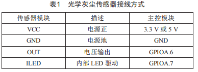 光電元件的輸出經(jīng)過信號處理電路后發(fā)送給單片機,單片機將當(dāng)前檢測濃度與灰塵濃度設(shè)定值進行對比,判斷下一步清掃動作。智能清潔系統(tǒng)啟動后,傳感器開始工作,若測得灰塵濃度大于預(yù)先設(shè)定值,單片機向驅(qū)動器發(fā)送繼續(xù)清掃的指令,到達組串邊緣時,行進電機反轉(zhuǎn),對該區(qū)域進行重復(fù)清掃,直到檢測值小于設(shè)定值。若檢測到灰塵濃度小于設(shè)定值,則清潔系統(tǒng)只進行單程清潔,到達組串邊緣后,若未接收到停機信號,則通過橋接支架進入下一組串繼續(xù)進行清掃。光學(xué)灰塵傳感器接線方式如表1所示。