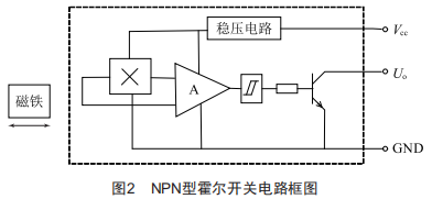 智能清潔機器人到達組串邊緣時,限位裝置給出動作信號。霍爾接近開關(guān)可以在接近物體一定距離內(nèi)檢測有無物體靠近,它不像機械行程開關(guān)由物體的碰觸實現(xiàn)電路通斷的開關(guān),而是在接近設(shè)定距離后給出高電平或低電平的電信號。在本設(shè)計中,選用NPN常開型霍爾傳感器作為限位裝置,可以實現(xiàn)非接觸檢測,不影響機器人運行狀態(tài),無機械磨損,并且定位準(zhǔn)確度高,響應(yīng)迅速,適用于光伏陣列應(yīng)用場景。安裝時,磁極軸線與霍爾接近開關(guān)的軸線要在同一直線上,當(dāng)磁鐵隨著智能清潔機器人移動到距離霍爾接近開關(guān)幾毫米時,霍爾接近開關(guān)的輸出由高電平翻轉(zhuǎn)為低電平,機器人停止運動。其電路框圖如圖2所示。