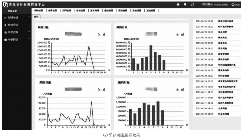 目前,煤礦企業(yè)物資管理信息化平臺(tái)已在貴州某煤礦集團(tuán)公司及下屬煤礦企業(yè)投入應(yīng)用,經(jīng)過(guò)一年多的使用,平臺(tái)運(yùn)行穩(wěn)定可靠,可為集團(tuán)公司減少因設(shè)備重復(fù)采購(gòu)造成的資源浪費(fèi),實(shí)現(xiàn)了資金流和物流的閉環(huán)控制,采購(gòu)流程自動(dòng)化,減少了庫(kù)存物資積壓,避免了物資多次重復(fù)采購(gòu)的現(xiàn)象,消除了集團(tuán)部門或下屬煤礦企業(yè)之間銜接不到位等問(wèn)題??傮w而言,平臺(tái)在集團(tuán)公司及下屬煤礦企業(yè)應(yīng)用效果良好。平臺(tái)效果展示如圖4所示。