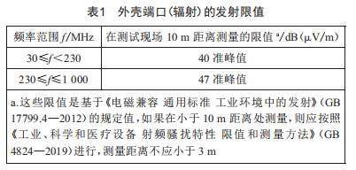 在裝置或裝置組合的每個(gè)外殼端口(輻射)測(cè)量的電磁發(fā)射水平不應(yīng)超過(guò)表1規(guī)定的限值。