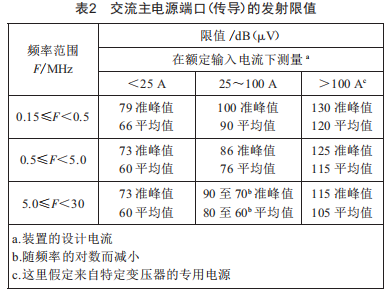 對(duì)于電壓有效值l000V以下的裝置或裝置組合,在其每個(gè)交流主電源端口測(cè)量的電磁發(fā)射水平不應(yīng)超過(guò)表2規(guī)定的限制。