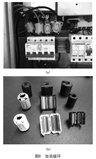 在電梯設(shè)備上加裝濾波器、磁環(huán)等也是有效和常見(jiàn)的電磁兼容設(shè)計(jì)手段。磁環(huán)用于吸收系統(tǒng)中多余的能量,并對(duì)多余的無(wú)價(jià)值的干擾進(jìn)行過(guò)濾,從而避免了電梯在使用過(guò)程中受到來(lái)自其他設(shè)備的不同頻段的電磁干擾影響。濾波就是對(duì)不需要的傳導(dǎo)性電磁干擾進(jìn)行抑制,濾波器實(shí)際上是一種過(guò)濾裝置,通常是由電感器、電容器、電阻器組成的濾波電路,將電梯系統(tǒng)不希望的頻率有效濾除。通常在主開(kāi)關(guān)進(jìn)線端、變頻器輸出側(cè)加裝磁環(huán),能較好地解決電磁干擾問(wèn)題,如圖8所示。當(dāng)然,根據(jù)線纜所連接的位置的不同、頻率的不同,可以更進(jìn)一步地精細(xì)化選擇磁環(huán)的型式,比如非晶磁環(huán)、錳鋅磁環(huán)、鎳鋅磁環(huán)。