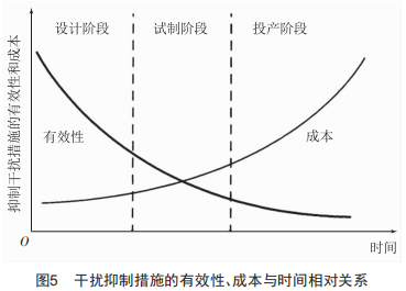 對(duì)電梯電磁兼容的改進(jìn)措施主要從抑制騷擾源、切斷騷擾耦合途徑、提高敏感設(shè)備的抗擾度三個(gè)方面進(jìn)行考慮[4-7],即分析電磁騷擾源、耦合路徑和敏感設(shè)備,并采取有效的技術(shù)手段。電梯電磁兼容的改善貫穿電梯的全生命周期,當(dāng)然,在電梯的設(shè)計(jì)階段采取合理的防干擾措施有效性最高,需要的成本也最低,如圖5所示。