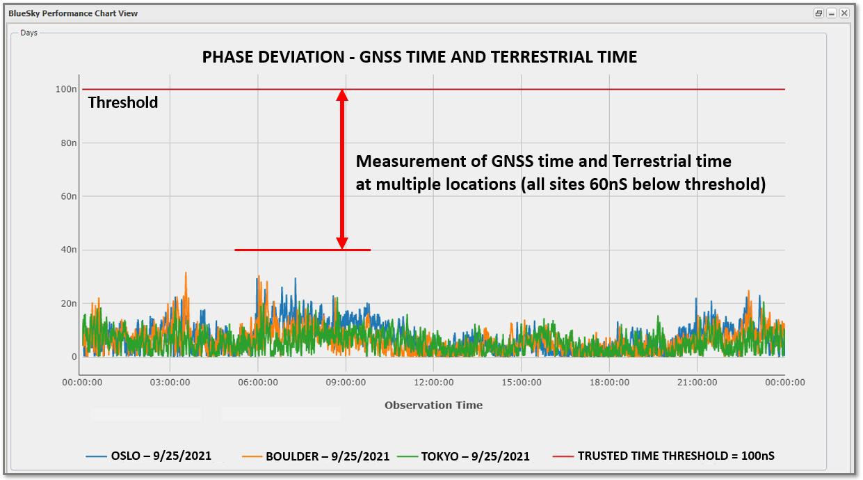 在管理大型地理區(qū)域時,如果能夠同時測量多個位置的GNSS時間與地面時間之間的相位差,那么運營商便可對這兩種時間源進行比較。如前文所述,最好使用兩種時間源來實現(xiàn)關(guān)鍵基礎(chǔ)設(shè)施運營商最終需要的彈性。通過在多個位置對比測量這兩個時間源,可以得知各個獨立時間源是完全一致的,這有助于建立最高級別的信任。