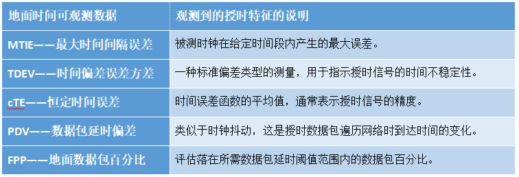 表征地面時間的質(zhì)量需要在單個位置(局內(nèi))或跨網(wǎng)絡(luò)節(jié)點(局間)的設(shè)備互連之間進行時間測量——例如,比較設(shè)備輸入和輸出或比較不同站點的信號。此外,隨著PTP的標(biāo)準(zhǔn)化,需要能夠評估網(wǎng)絡(luò)授時數(shù)據(jù)包指標(biāo)的能力,以驗證從一個位置到另一個位置的時間傳輸。地面時間性能要求使一組不同的可觀測數(shù)據(jù)可視化并受到監(jiān)測。表2提供了關(guān)鍵地面時間可觀測數(shù)據(jù)的示例。