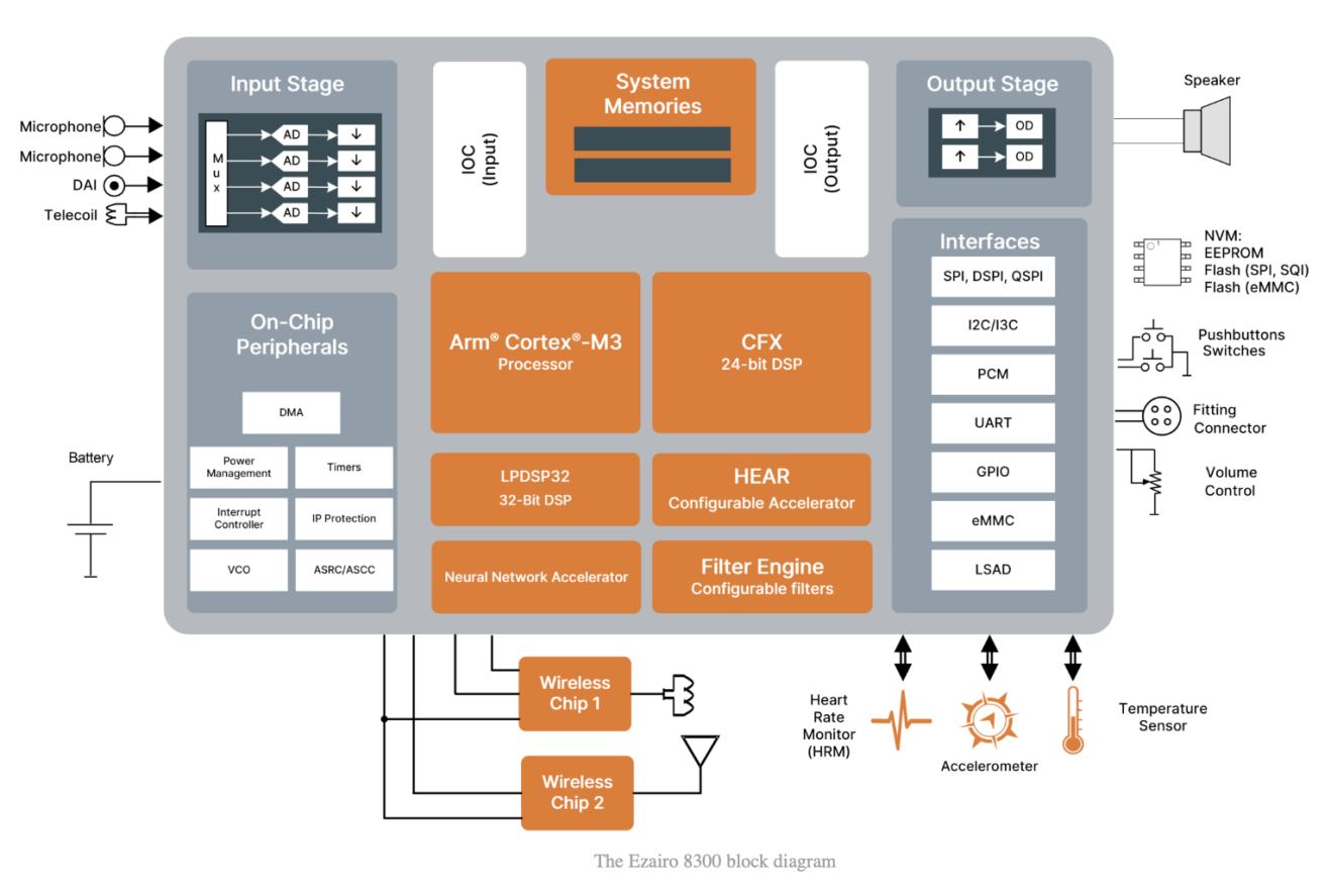 近年來(lái)單片式的DSP逐漸被Arm核的芯片、FPGA等所取代,變成IP形式存在。但在某些領(lǐng)域,DSP有著不可撼動(dòng)的地位。就像助聽(tīng)器這一領(lǐng)域,DSP仍是為聽(tīng)障人士實(shí)現(xiàn)清晰可靠的音頻處理的最優(yōu)解。而在做好基礎(chǔ)的音頻處理的前提下,助聽(tīng)器中的DSP也在向著無(wú)線音頻傳輸、AI+的方向上開(kāi)始拓展。在簡(jiǎn)單傳統(tǒng)的單片式DSP的基礎(chǔ)上,CPU(Cortex-M等)、模擬前端(FAE)、BLE無(wú)線和神經(jīng)網(wǎng)絡(luò)加速器(NN Accelerater)等按需集成到了DSP上,一起實(shí)現(xiàn)了系統(tǒng)單芯片(SoC)的助聽(tīng)器解決方案。