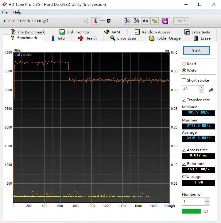 使用HD Tune對T700進行穩(wěn)定性測試,測試長時間2000GB讀取,可以看到整個讀取過程都沒有出現(xiàn)降速的情況,有點疑惑的是讀取速度只有不到3000MB/s,可能HD Tune尚未適配12GB/s的高速讀取測試。