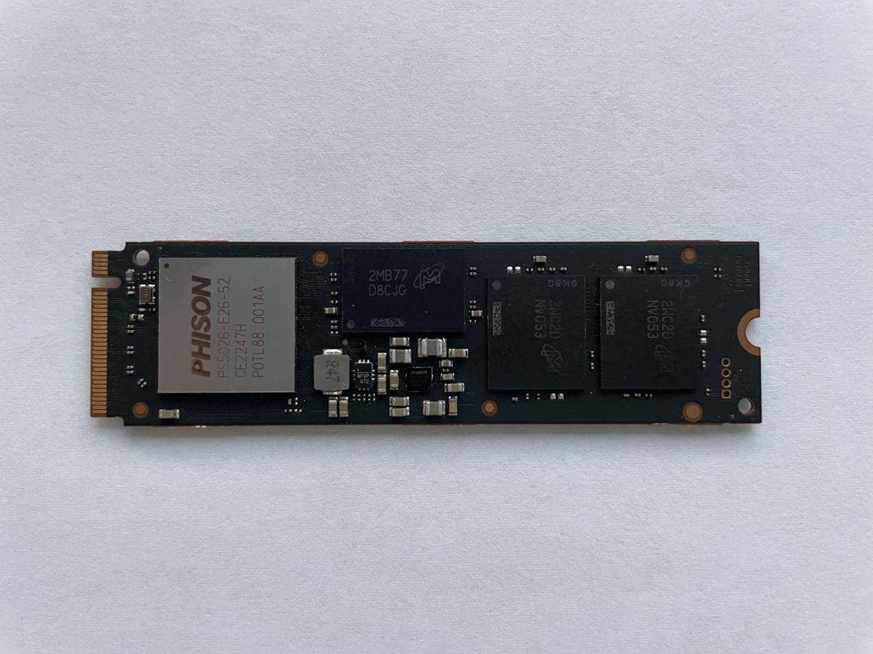 把正面的硅脂清理干凈后可以看清整個全貌,主控為Phison PS5026-E26,Phison 最新的 PCI-Express 5.0 控制器。DRAM為2MB77 D8CJG,美光MT53E1G32D2FW-046 容量為4G。顆粒為美光NV053,3D TLC 232L NAND,正反面共4顆,單顆500G容量。