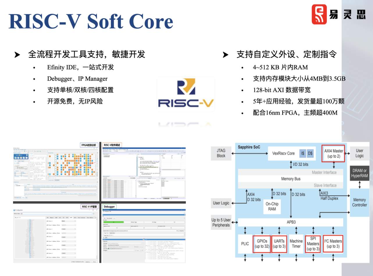 據(jù)悉,該RISC-V的內(nèi)核來自GITHUB上的一個開源項目,易靈思從2018年開始引入,并且多年來歷經(jīng)了數(shù)次迭代。從最初的性能一般的小核,到現(xiàn)在已經(jīng)可以做到300MHz、400MHz甚至更高。而且用戶在這個內(nèi)核上可以進(jìn)行非常多自定義外設(shè)的配置,增加客戶自己想要的指令,包括1核、2核、4核都可以進(jìn)行配置。