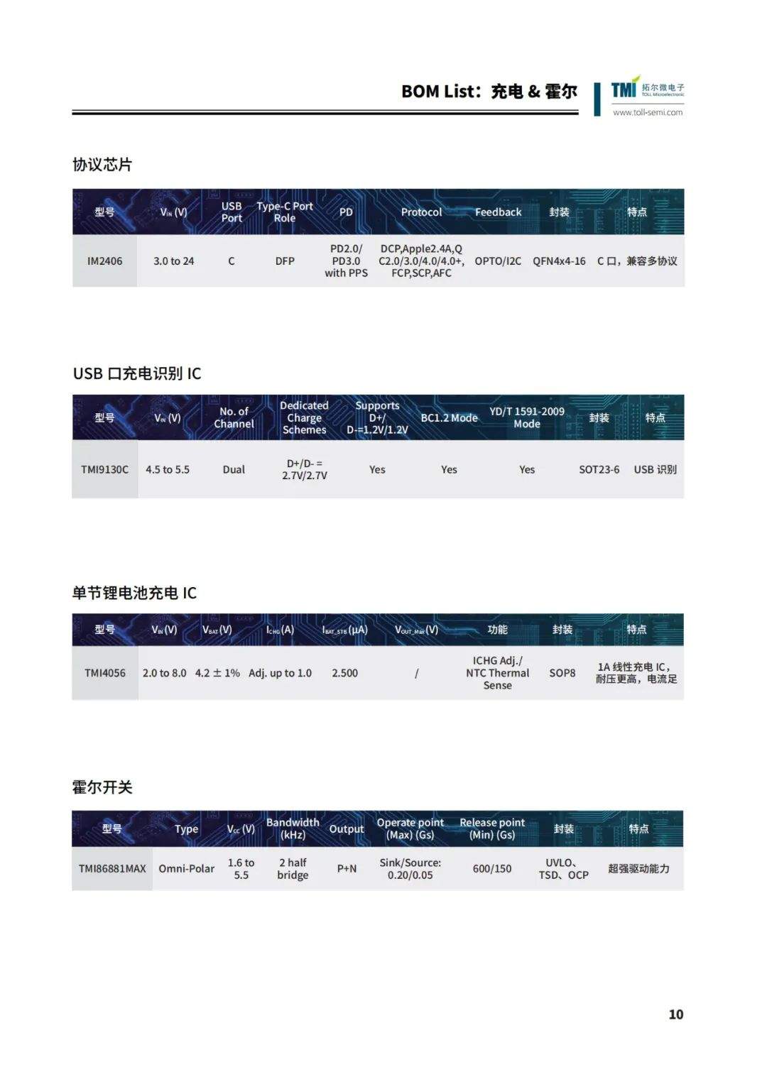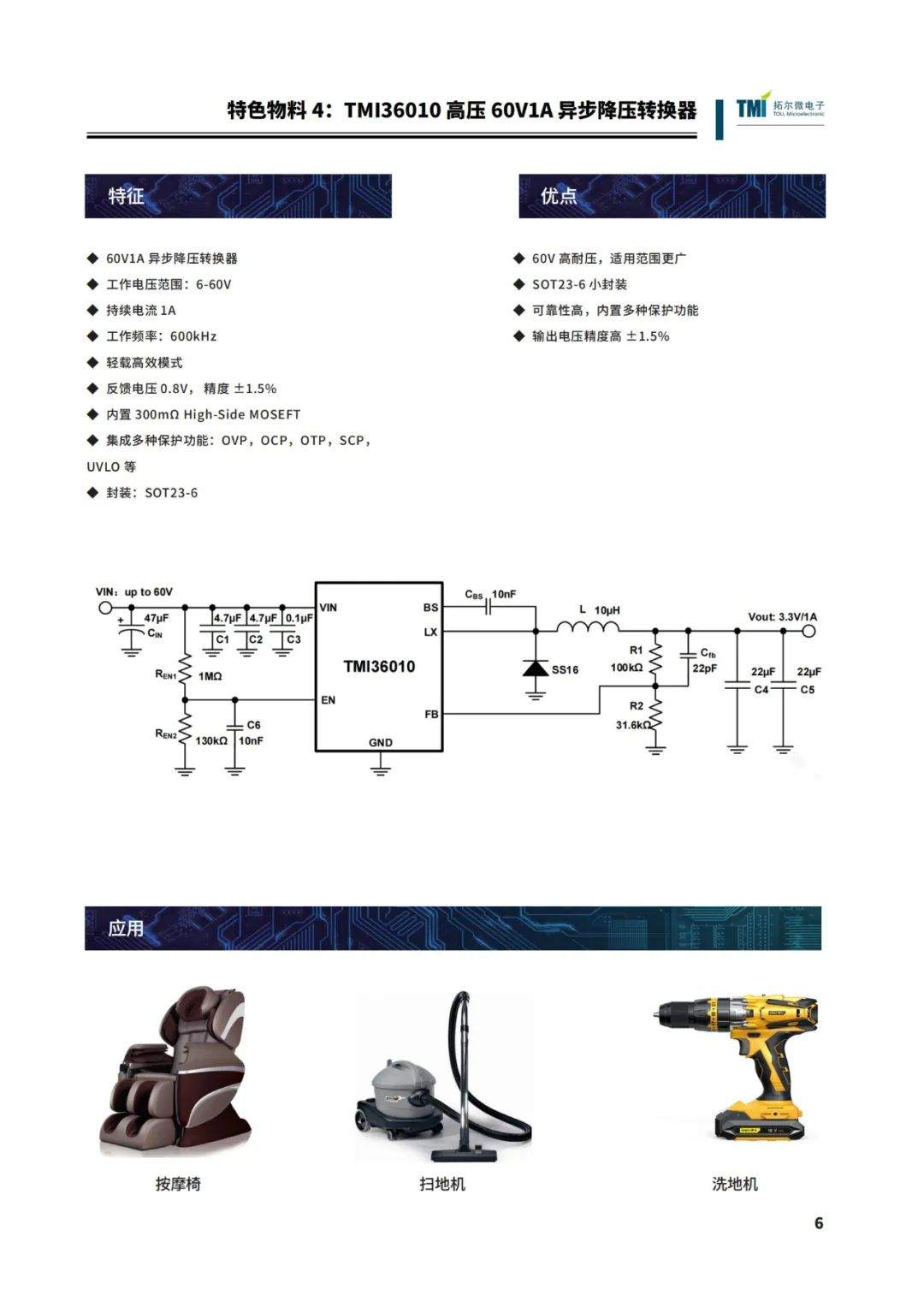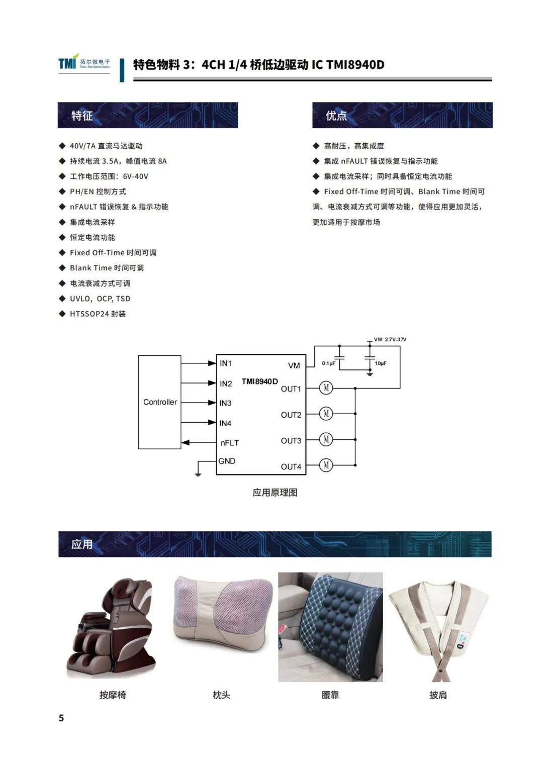 想要產(chǎn)品實(shí)力好,芯片解決方案至關(guān)重要!拓爾微在芯片領(lǐng)域有多年積累與沉淀,已有多款電源管理芯片、馬達(dá)驅(qū)動(dòng)芯片,充電&霍爾開關(guān)等形成全套按摩椅解決方案。為滿足市場(chǎng)上各類按摩椅產(chǎn)品設(shè)計(jì)的選型需求,為客戶提供一站式優(yōu)質(zhì)服務(wù),我們推出了按摩椅專題期刊——本期刊重點(diǎn)介紹了按摩椅系列拓爾BOM方案,物料清單及5款特色物料,包括產(chǎn)品的特點(diǎn)、應(yīng)用注意事項(xiàng)、適用場(chǎng)景等——TMI8360SP替代繼電器方案和分立器件方案、40V3.5A直流馬達(dá)驅(qū)動(dòng)IC-TMI8130、4CH 1/4橋低邊驅(qū)動(dòng)IC TMI8940D、TMI36010高壓60V1A異步降壓轉(zhuǎn)換器、3W單通道D類音頻功放TMS8010/TMS8020。