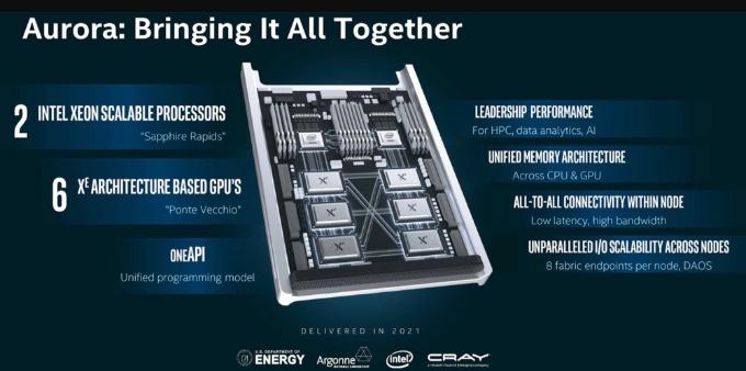 Aurora超級計算機采用由1024個固態(tài)存儲設備組成的存儲節(jié)點陣列,提供220PB的容量以及31TB/s的總帶寬,這將有助于處理涉及海量數(shù)據(jù)集的工作負載,例如核聚變研究、科學工程、物理模擬、治療研究、天氣預報和其他任務。