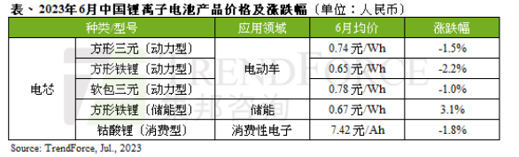 Jul. 5, 2023 ---- 6月中國市場動力電池價格續(xù)跌,但各類產(chǎn)品跌幅開始收斂,據(jù)TrendForce集邦咨詢研究顯示,6月車用方形三元電芯、鐵鋰電芯及軟包型三元動力電芯均價(以下均以人民幣計)月跌幅1~2%,分別跌至人民幣0.74元/Wh、0.65元/Wh和0.78元/Wh,主要是上游材料成本下降,帶動電芯成本向下,需求方面6月動力電池市場需求穩(wěn)步復蘇,已逐漸恢復至2022年第四季水平。