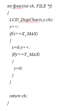 這個(gè)fputc將字符顯示在了液晶上(同時(shí)維護(hù)了字符的顯示位置信息),這樣當(dāng)我們調(diào)用printf的時(shí)候,信息會(huì)直接顯示在液晶上。